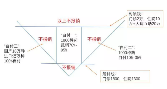醫(yī)療險大家都知道吧,今天咱們就來聊聊醫(yī)療保險。大家比較熟悉的一個是一老一小,一個是新農(nóng)村合作社。基本上,可以報銷醫(yī)院的一部分。如果您愿意交,國家就承保。并且報銷還是有起付線,封頂線,報銷比例。如下所示。