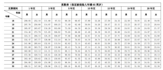 系數(shù)表對應(yīng)值:就是投保的年齡不同,選擇不同的交費(fèi)期,保至不同的年齡。簡單來說就是每個人的情況不一樣,交的保費(fèi)不一樣。